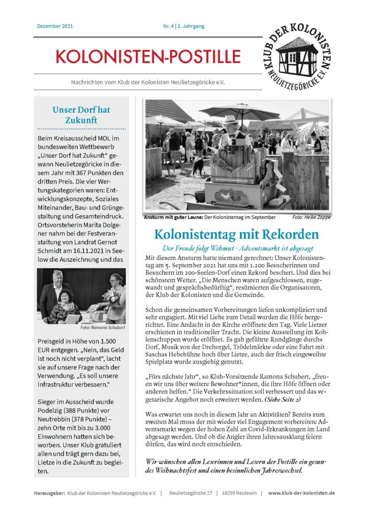 Die Kolonisten-Postille ist eine regelmäßig erscheinende Publikation des Klubs der Kolonisten Neulietzegöricke e.V.. Sie wird an alle Haushalte des Dorfs und seiner Umgebung zugestellt. Hier können Sie alle Ausgaben nachlesen. Zum Vergrößern bitte auf die Bilder oder auf „PDF Download“ klicken.
