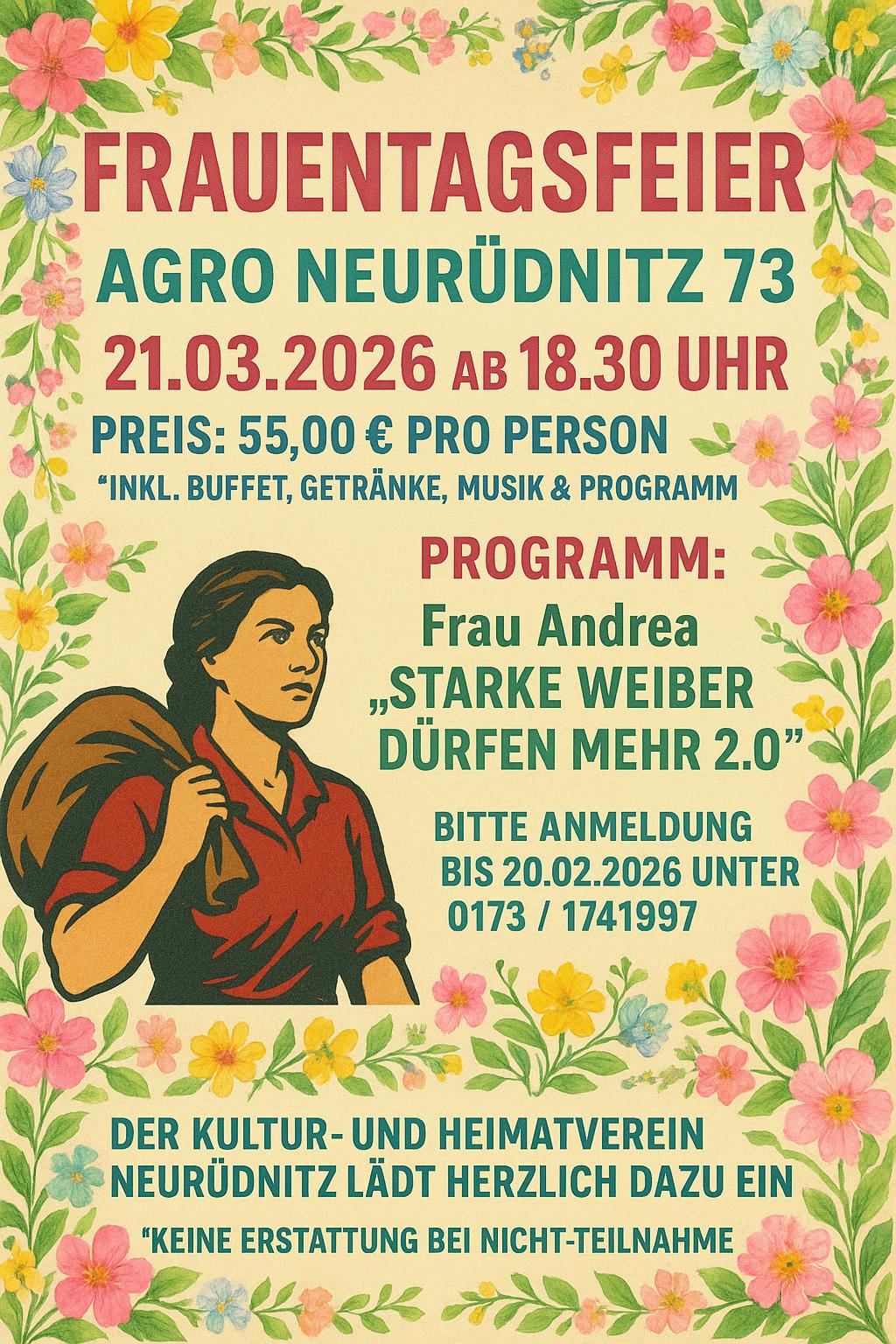 21 März / 6:30 pm Frauentagsfeier in Neurüdnitz Agro Neurüdnitz Neurüdnitz 73, Oderaue-Neurüdnitz, Brandenburg, Germany €55,00