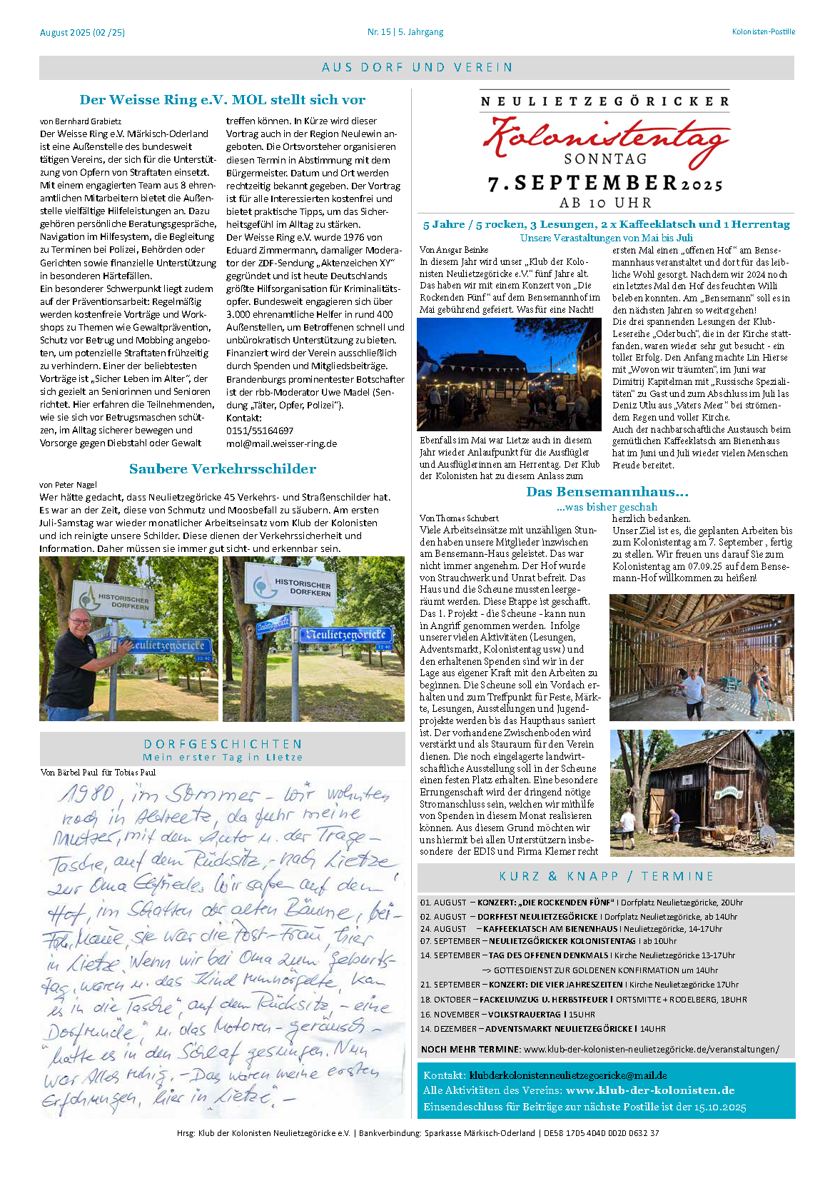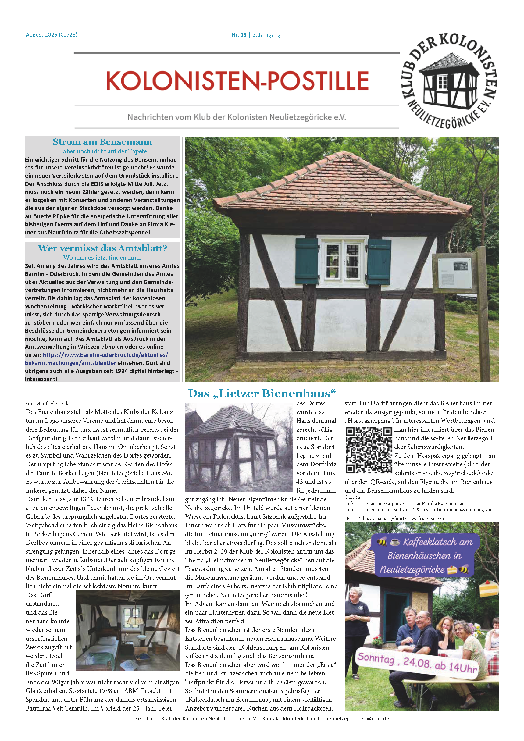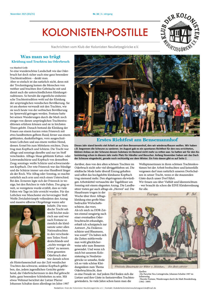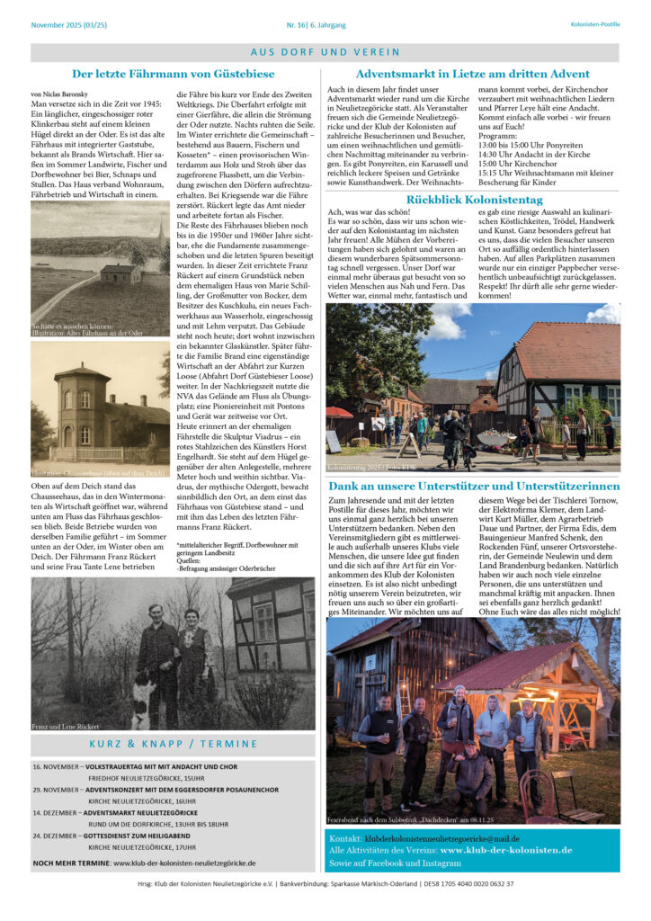 Die Kolonisten-Postille ist eine regelmäßig erscheinende Publikation des Klubs der Kolonisten Neulietzegöricke e.V.. Sie wird an alle Haushalte des Dorfs und seiner Umgebung zugestellt. Hier können Sie alle Ausgaben nachlesen. Zum Vergrößern bitte auf die Bilder oder auf „PDF Download“ klicken.